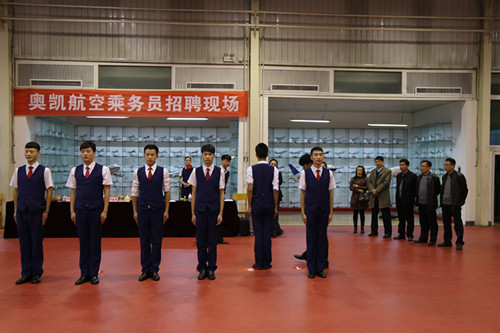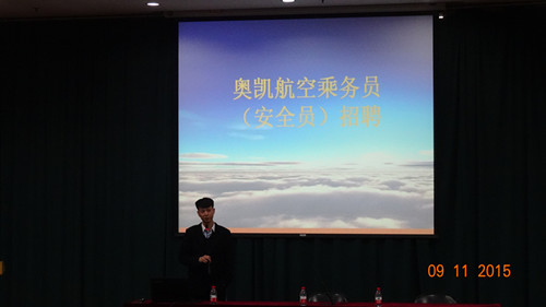 在面试开始前,奥凯航空有限公司招聘人员首先在科学会堂二层报告厅举办了宣讲会,对本次面试流程及公司未来发展前景作了简单介绍。本次招聘考试分为初试、复试两个环节,包括自我介绍、个人形象气质、中英文广播词、形态外观、身高以及蹲起测试等内容。