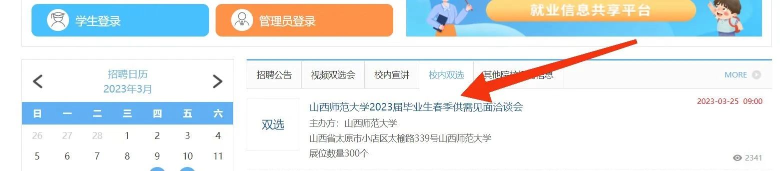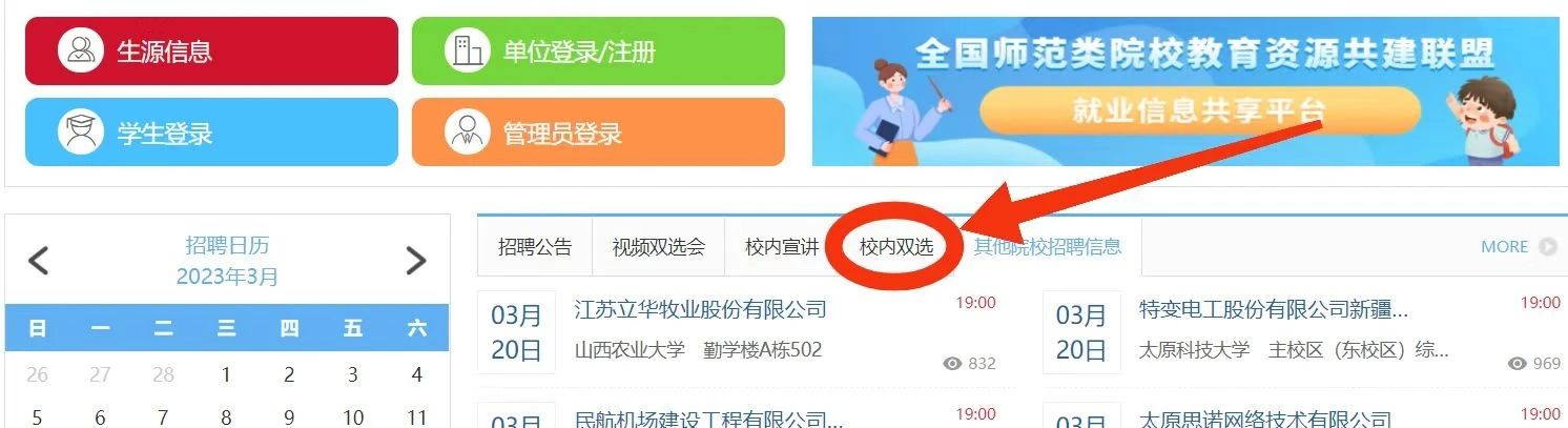 2、浏览器搜索打开必发集团7790就业信息网(http://sxnu.bysjy.com.cn/),进入页面后选择”校内双选”,点击“必发集团77902023届毕业生春季供需见面洽谈会”即可进入双选会,进行电子简历投递。