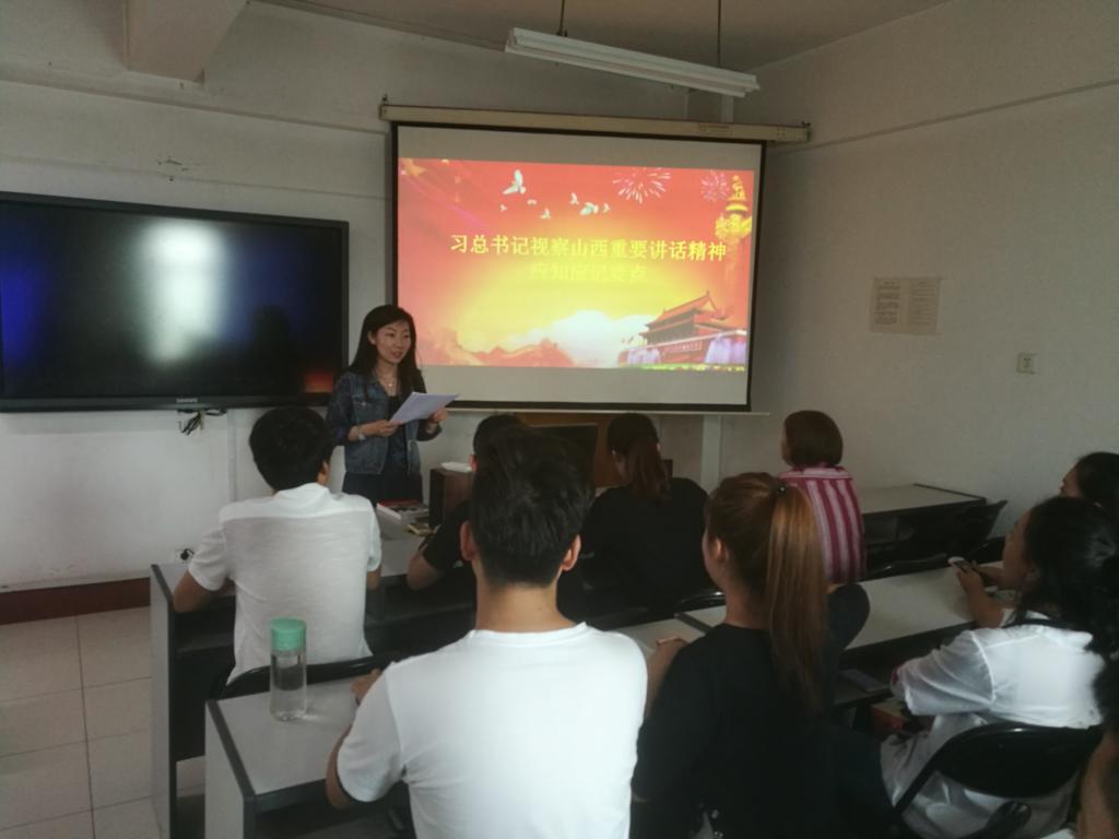 会上,支部书记杨谨瑜老师带领大家认真学习了习近平总书记视察山西重要讲话精神的应知要点并传达了重要讲话精神。她强调了学习习近平总书记视察山西重要讲话精神的重要性,是推进“两学一做”学习教育常态化制度化、开展维护核心见诸行动主题教育和加强“三基建设”的重要内容,都具有重要意义。同时为广大青年学子健康成长指明了方向、寄予了厚望,也为培养中国特色社会主义法治人才提供了科学指南和根本遵循。