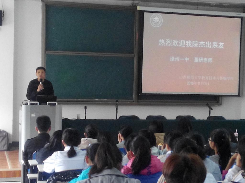 11月1日下午,我院教育技术学专业06届优秀毕业生、泽州一中信息中心主任董研老师返校与教育技术学专业师生进行交流座谈。活动分为两个部分:下午2:30在07126教室,董研老师为教育技术学专业的全体本科生和部分研究生做有关于就业创业方面的专题讲座,并与学生进行交流互动。下午5:00,在科学会堂B503会议室,董研老师与部分教育技术学专业教师进行了座谈。副校长王云老师出席了专题讲座和教师座谈,副院长汪存友老师主持了本次活动。