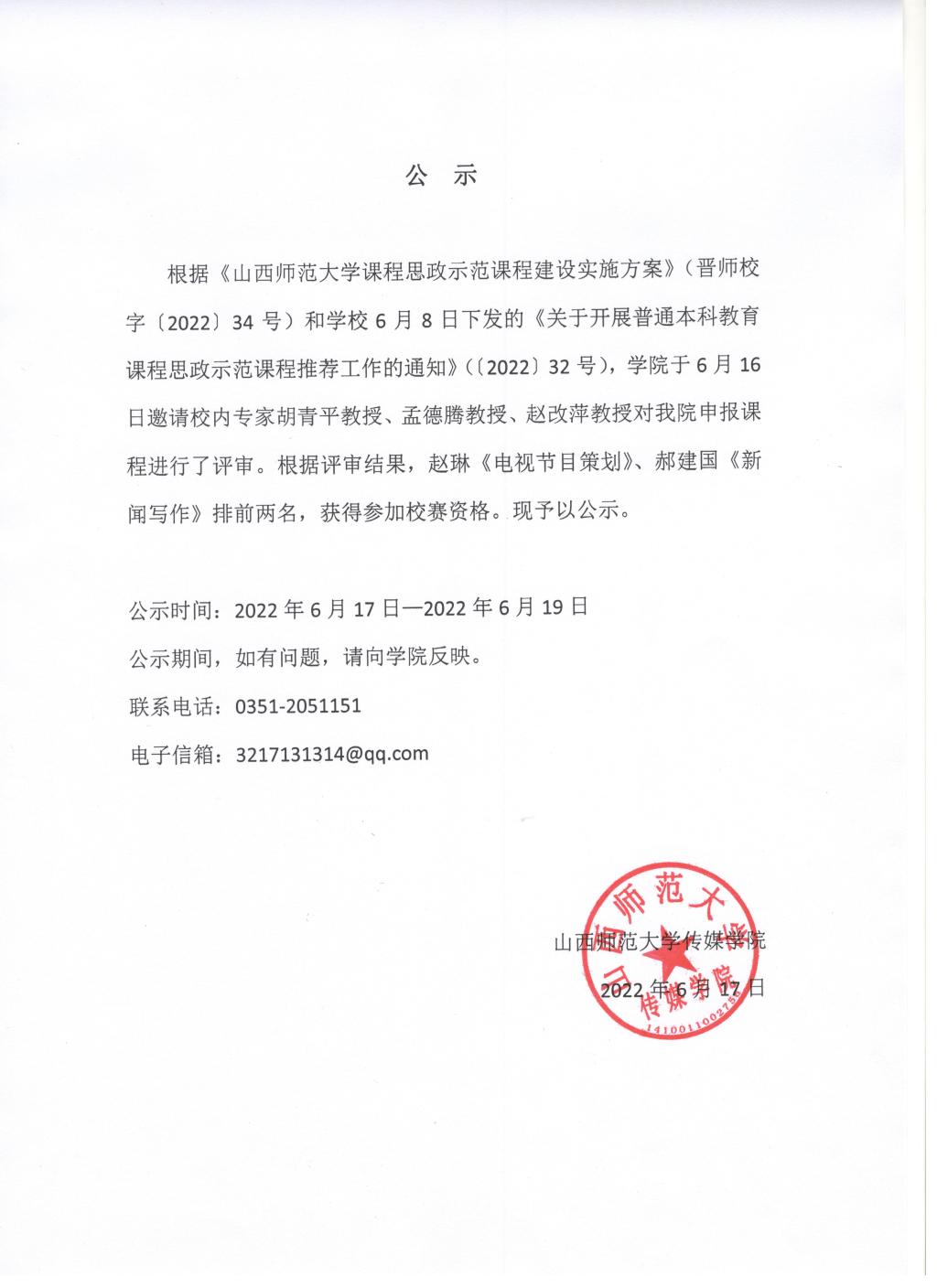 关于推荐教师参加学校课程思政示范课程评比的公示