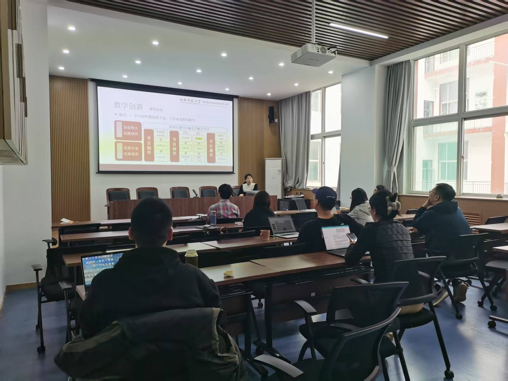11 月 6 日下午3点,我院编导播音党支部组织专项教研活动。支部书记郝建国主持活动,介绍了我院“教师创新比赛”工作部署,强调了创新在教育教学中的重要性,鼓励教师们积极参与,以赛促教,提升教学水平和创新能力。