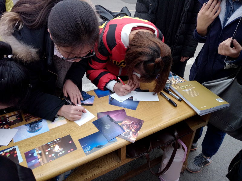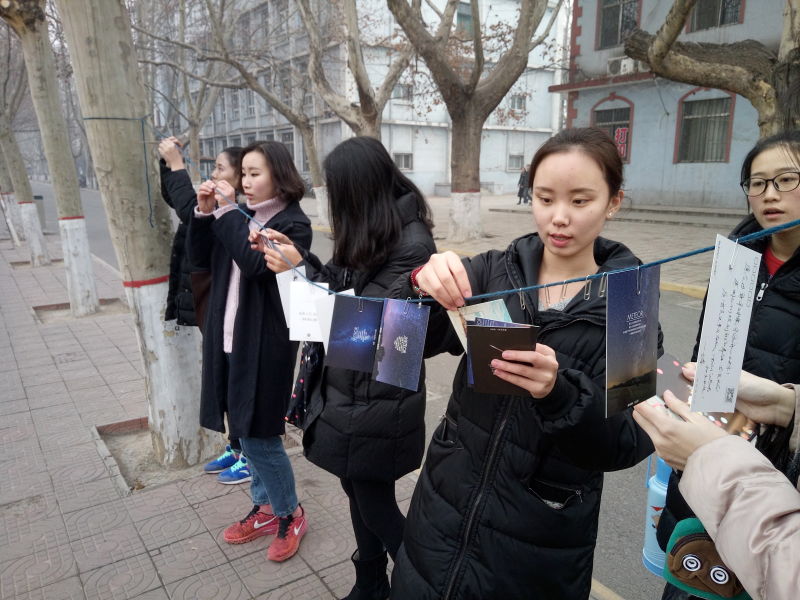 活动中,文艺部的同学们精心准备了明信片,邀请路过的同学在明信片上写下自己对家人的问候与祝福,并在条幅上签上自己的名字,期间,他们为同学们送上了一杯杯热水,简简单单的一杯热水,虽然很平常,却温暖了身边的每一个同学。
