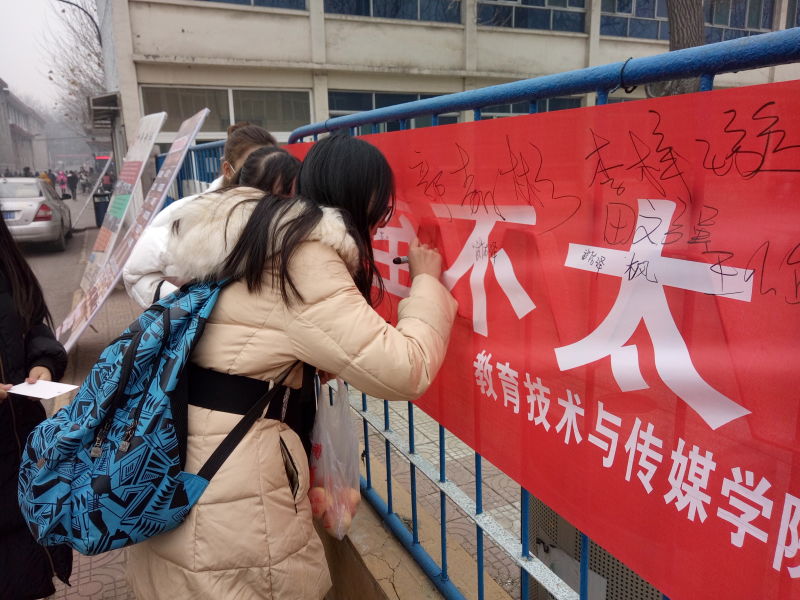 活动后,一张张写满同学们寄语的明信片被悬挂在师表路旁边的大树上,随之起舞的,还有签满同学们名字的主题条幅。