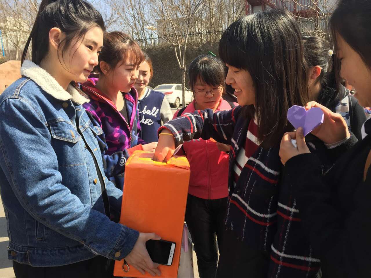 活动一开始,便吸引了许多同学们的注意,路过的同学们纷纷参与其中,以抽取纸质爱心的方式,将自己心中最想说的话写在心形卡片上,一张张的心形卡片,每一张都展示了最真的自己,之后,每一位参与活动的同学都在活动条幅上签下了自己的名字,留下了最美的“自己"。活动最后,由我院团委学生会的同学将精心准备好的小礼品送给参与活动的每一位同学,活动在热情的氛围下顺利结束。