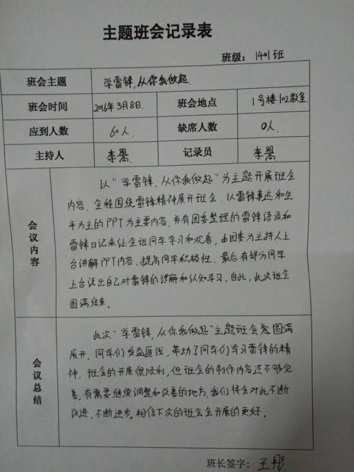 在活动中,15级广编班以播放ppt的形式对雷锋同志的生平事迹进行了具体的了解,并由部分同学上台选读了具有代表性的几篇《雷锋日记》,对雷锋精神进行了深入的学习,14级广编班通过以拍摄身边文明行为照片的形式来提倡大家在日常生活中要时刻保持文明的作风习惯,15级空乘3班的同学们则以自述雷锋同志生平的故事来激励同学们要向雷锋同志看齐,以此为榜样。各班级以不同形式组织学习雷锋精神。班会最后,由各班级记录员将班会内容进行归纳总结。