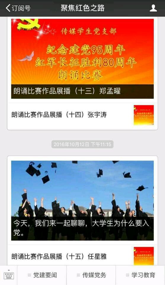自9月23日至10月底,我院传媒学生党支部开展了“庆祝建党95周年,红军长征胜利80周年”朗诵比赛,本次比赛以微信公众平台作为媒介,创新活动形式的基础上,使活动的开展更为便捷,提高了同学们对活动的参与度。