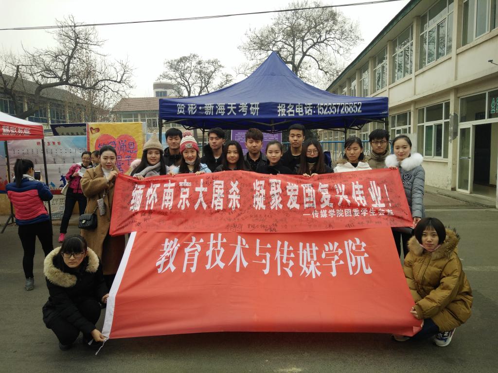 为营造铭记历史、珍视和平、警示未来的浓厚氛围,引导学生树立正确的历史观、民族观。12月13日中午,我院团委学生会在校医院门口举办了以“缅怀南京大屠杀,凝聚爱国主义伟业”为主题的横幅签名活动。