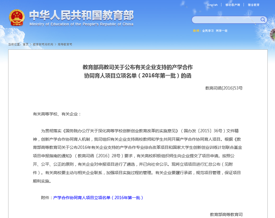 我院入选教育部高教司关于公布有关企业支持的产学合作协同育人项目(2016年第一批)