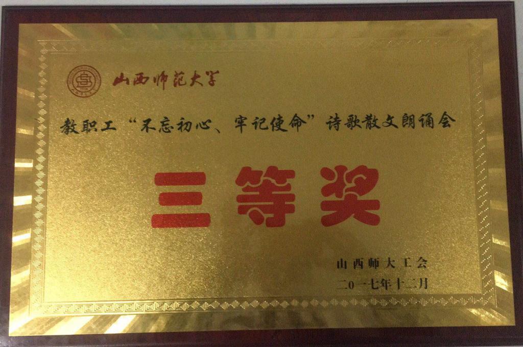 12月29日,我校工会主办的“不忘初心、牢记使命”教职工诗歌散文朗诵会在文化艺术活动中心举行。我院参赛的合诵节目《梦想照亮中国》荣获全校三等奖。