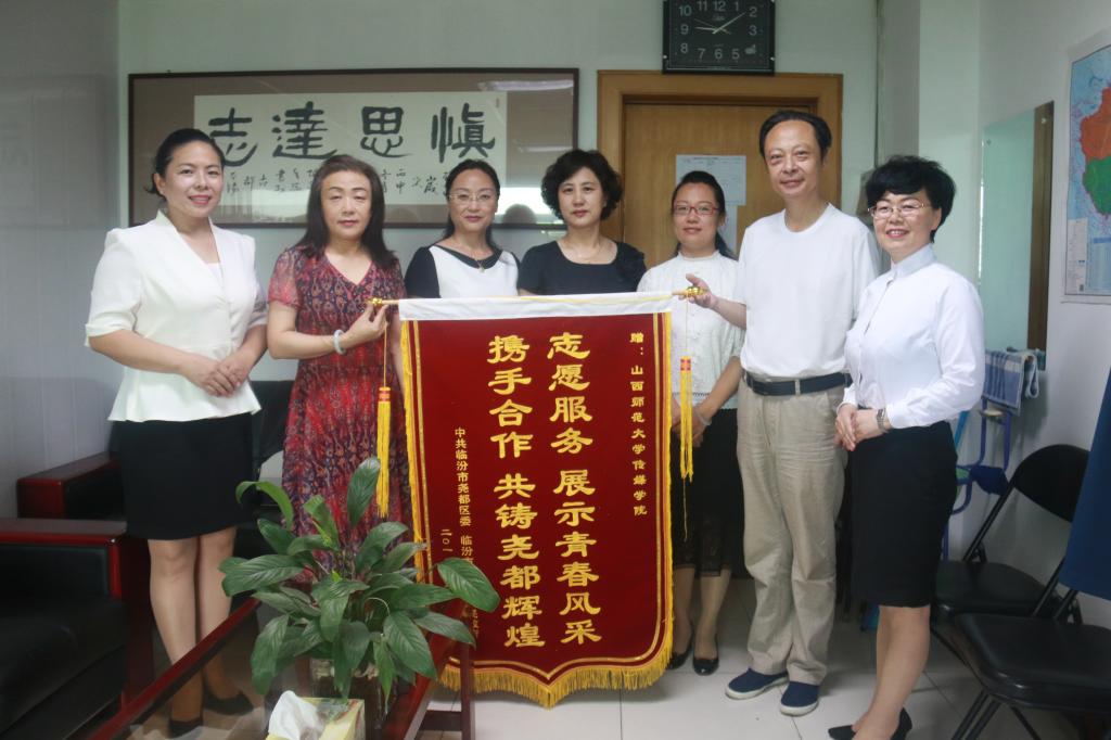 6月27日上午,帝尧管委会办公室主任张晓华、共青团尧都区委员会书记任艳玲、中国东方礼仪研究院临汾分院院长李爱琴、副院长李晓雁等一行5人来到我院,向我院赠送题为:“志愿服务,展示青春风采;携手合作,共铸尧都辉煌”锦旗,感谢我院学子在首届尧都文化旅游节系列活动中的优异表现。