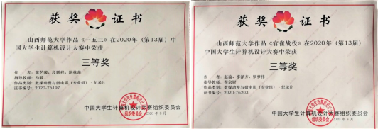 中国大学生计算设计大赛组委会本着公平、公正、公开的原则,对每一件参赛作品进行评比。大赛以三级竞赛形式开展,经过校级初赛、省级复赛、国家级决赛等环节的角逐,在山西赛区多所高校参评的众多作品中,我院广播电视专业2016级张艺馨、段鹏程、路林蒲三位同学的作品《一五三》,广播电视专业2017级赵瑜、李泽方、罗梦伟三位同学的作品《官雀战役》获得国家级数媒动漫与微电影(专业组)三等奖,并获得山西省级数媒动漫与微电影(专业组)二等奖。