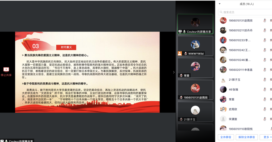 会上,文婷老师传达了学校《关于开展以“联大”“抗大”精神为主题的“四史”学习讨论活动实施方案》精神及学院具体学习安排。接着,她从开展“四史”教育的背景意义、具体内涵及学习要求展开,详细介绍了“联大”“抗大”精神的深刻含义与时代意义。要求大家深入学习“四史”知识,深刻理解中国共产党为什么“能”、马克思主义为什么“行”、中国特色社会主义为什么“好”,不断从中深入领会学习马克思主义理论的重要意义,感悟马克思主义的真理力量,自觉做中国特色社会主义的坚定信仰者、忠实实践者。