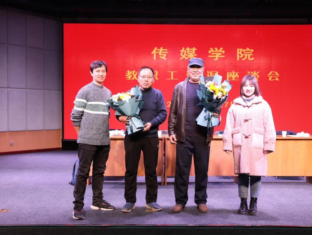 座谈会上,大家齐聚一堂,其乐融融。教职工代表向两位荣退教师献花,向他们对学院的付出和贡献表达真挚感谢。退休教师也感触颇多,他们回顾了自己在学校的工作历程,见证了学院一步步的发展壮大,表示今后会继续关心学院,支持学院的改革和发展。