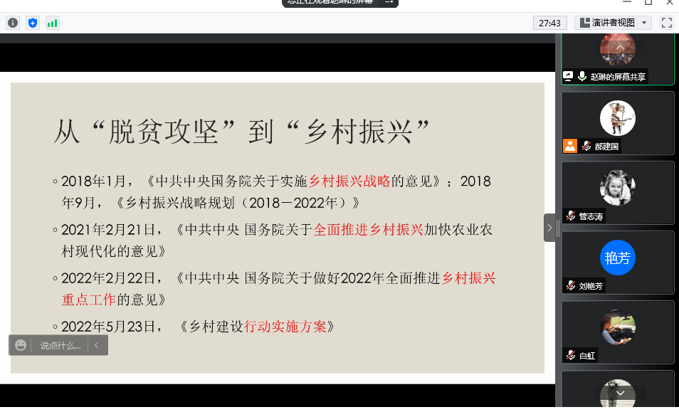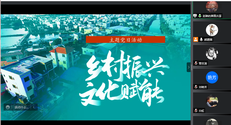 实施乡村振兴战略,是解决新时代我国社会主要矛盾、实现“两个一百年”奋斗目标和中华民族伟大复兴中国梦的必然要求,具有重大现实意义和深远历史意义。会上,宣传委员赵琳以“乡村振兴,文化赋能”为题,对2022年3月发布的《关于推动文化产业赋能乡村振兴的意见》进行了解读:以城带乡、城乡互促是文化产业赋能乡村振兴的指导思想,多业并举是文化产业赋能乡村振兴的基本路径,多方参与是文化产业赋能乡村振兴的重要保障,并分析了乡村振兴战略与专业教学、科学研究、创新创业、实习实训基地建设之间的关系。随后,支部成员就如何将学科建设与国家战略、地方发展结合进行了讨论。