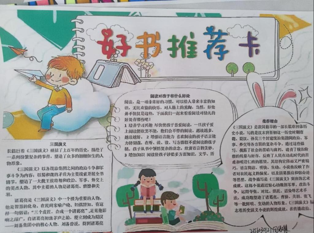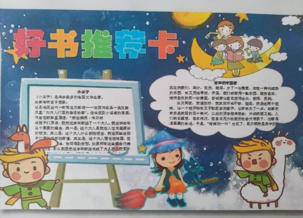 此次活动以做手工的形式让同学们制作“好书推荐卡”,同学们在认真阅读的基础上,选择自己最喜爱的好书,把好书中的主要内容、值得阅读的原因、部分精彩语句以及自己阅读时的感受,摘录编写在“好书推荐卡”上。在这个过程中同学们不仅可以重新温习所介绍的书籍,同时还可以发挥想象力设计出图文并茂的“好书推荐卡”,进一步增加阅读兴趣,激发活力。