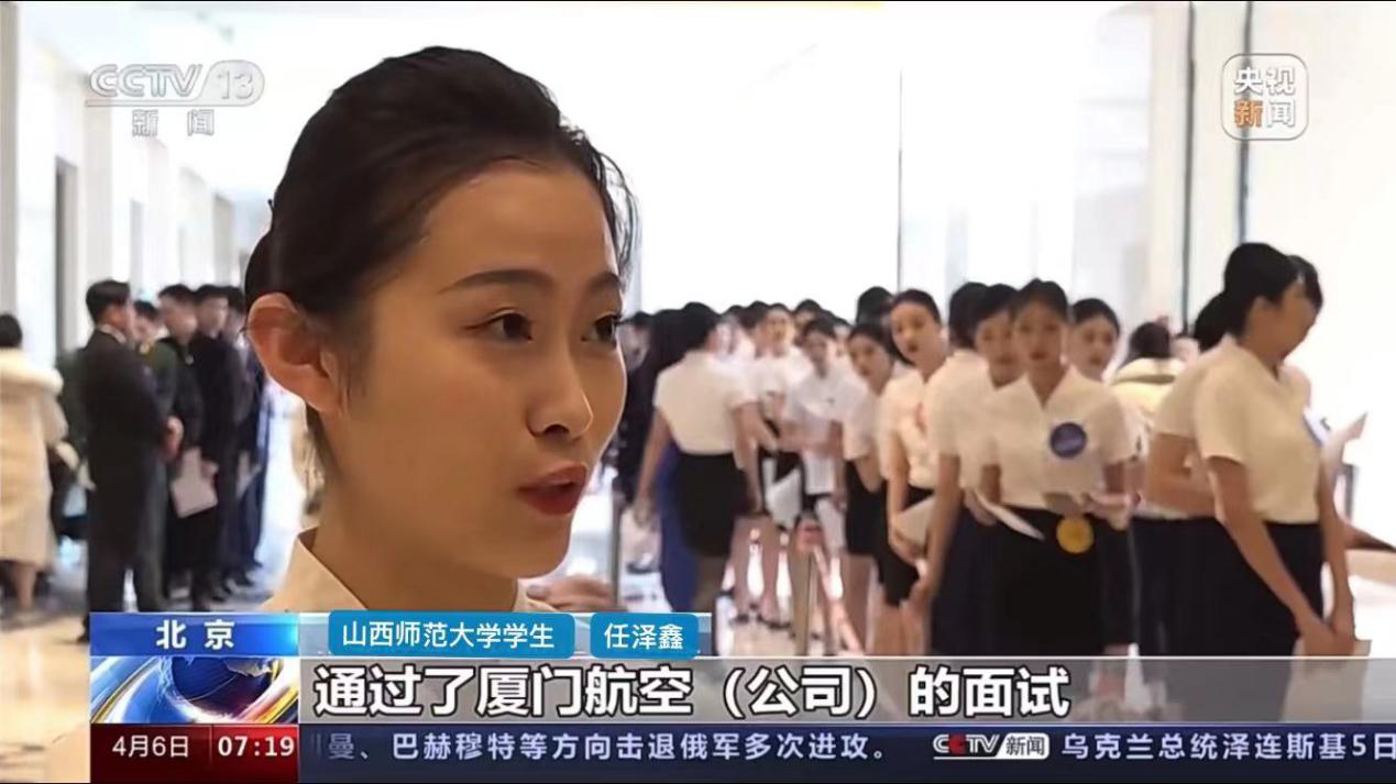 本次春季双选会以“招聘专场 职等你来”为主题,于3月28日—4月1日举行,为期5天,是中国高等教育博览会产教融合系列活动的一部分。此次双选会共有全国百余家用人单位进行现场招聘,涉及航空公司、机场集团、以及多家国有企业、事业单位等。经过严格面试和激烈角逐,我院34名航空专业的学生在这次双选会中面试到心仪的工作岗位。其中高宇旋、苑慧颖、王哲阳、韩霄琳等七名同学被深圳航空录取,李紫苑、赵子琛、韩宁被海南航空录取,闫雨娜、李慧洁、王嘉欣、宋子怡四位同学被川航录取,张文玉、韩镇亚、魏晓晶被招商局录取。在央视播出的“各地采取多种措施促进高校毕业生就业”新闻中,我院航空服务艺术与管理专业20级学生任泽鑫同学接受了央视记者的采访。