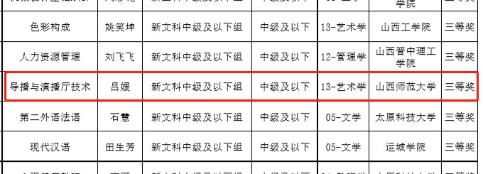 日前,省教育厅第三届全国高校教师教学创新大赛山西赛区组委会公示了省赛获奖名单,我院广播电视编导专业教师吕媛以《导播与演播厅技术》获得新文科中级组三等奖。