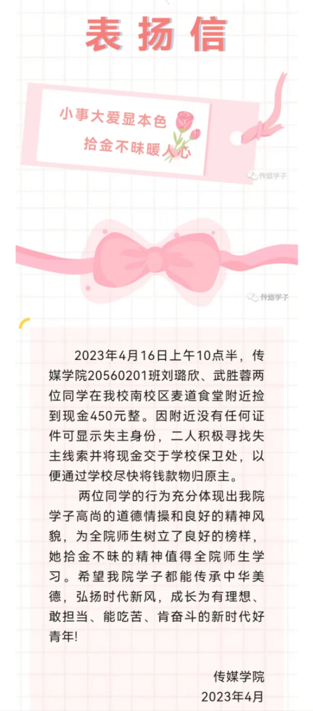 4月16日10点30分,刘璐欣、武胜蓉两位同学参加完党支部学习研讨会后,在南校区麦道餐厅附近捡到现金四百五十元整。两位同学在第一时间询问周边同学、努力寻找失主,在确认附近无失主线索的情况下,刘璐欣同学又通过学校万能墙和“我的校园我做主”平台积极寻找失主。4月20日,当消息发出三天仍未收到回应,刘璐欣同学在征求老师建议后,把捡到的现金交到了学校保卫处。经过保卫处一系列调查,最终联系到失主,并将现金全数归还失主。原来,失主是来我校参加普通高校招生体育专业考试的一名考生。事后,刘璐欣同学说:“作为中共预备党员,拾金不昧是一名党员应该具备的基本素养之一,都是我应该做到的。小事虽小,不为不成。我们应该以朴素善良、实际行动诠释属于我们的担当,做自己力所能及的正确的事情,哪怕做到的只是一件小事。”