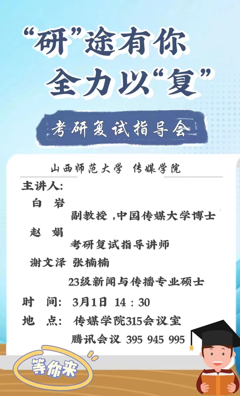 为扎实推进考研复试指导工作,帮助同学们掌握复试技巧,助力我院学子在复试中取得优异成绩。3月1日下午,我院在七号楼315会议室举办“‘研’途有你,全力以‘复’”考研复试指导会。会议采用“线上+线下”相结合的形式展开。我院党委副书记牛坚老师、全媒体中心主任白岩老师及学院部分教师、考研复试指导讲师赵娟老师、23级新闻与传播专业硕士谢文泽和张楠楠及大三、大四同学参会。