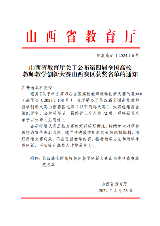 近日,山西省教育厅公布了第四届全国高校教师教学创新大赛山西赛区获奖名单,我院赵琳老师荣获新文科副高组三等奖。