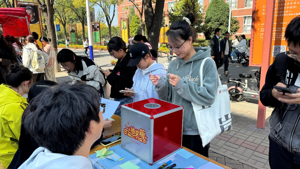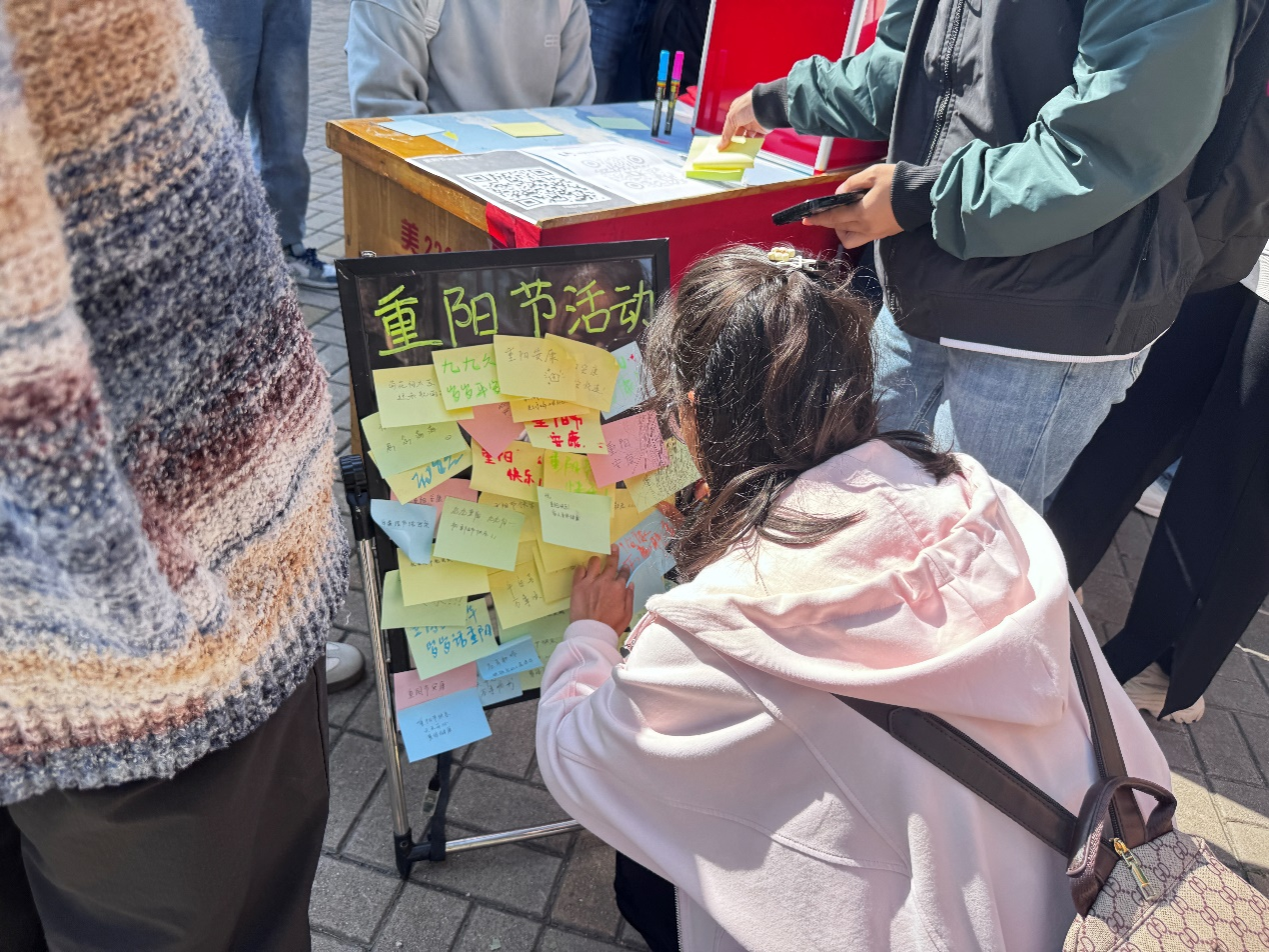 在活动现场共有三种参与方式:同学们在便签上写下自己对家中长辈朋友的祝福或与重阳节相关的诗词,并张贴在祈福墙上;同学们抽取箱子中的纸条,回答关于重阳节的诗词以及常识问题;扫码填写重阳节相关问卷。每一项活动都旨在通过不同形式,展现重阳节的独特韵味,让我院学子在轻松愉快的氛围中,深刻体会“老吾老以及人之老”的中华美德。