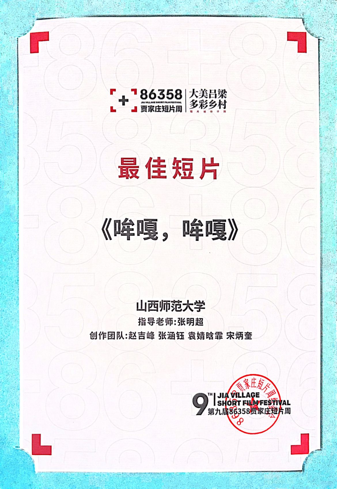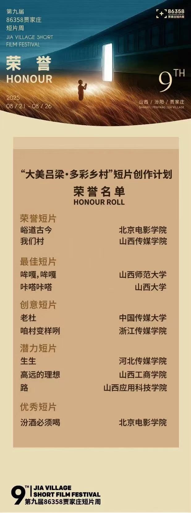 8月19日—8月26日,第九届“86358贾家庄短片周”在山西省汾阳市贾家庄举行,由我院广播电视编导专业赵吉峰、张涵钰、袁婧晗霏、宋炳奎四名同学创作,张明超老师指导的纪实短片《哞嘎,哞嘎》(Grandmother's Call),获得此次短片周“大美吕梁·多彩乡村短片创作计划”“最佳短片”。