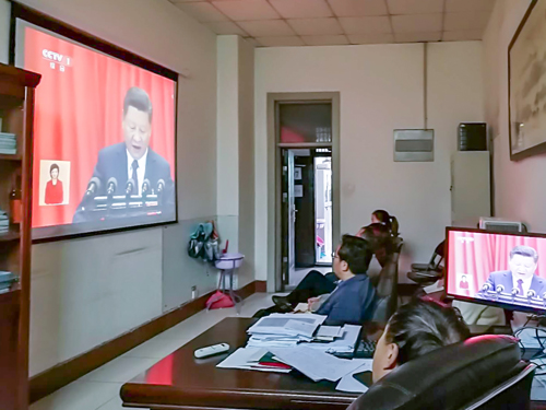 在开幕会直播期间,与会人员聚精会神听报告、全神贯注做笔记,认真学习领会报告精神。大家一致认为,中国共产党第十九次全国代表大会是在全面建成小康社会决胜阶段、中国特色社会主义进入新时代的关键时期召开的一次十分重要的大会。习近平总书记代表十八届中央委员会所作的报告全面审视当今世界和中国发展大势,准确把握发展新要求和人民群众新期待,深入总结党领导人民推进改革开放和社会主义现代化建设的生动实践和新鲜经验,对鼓舞和动员全党全国各族人民继续推进全面建成小康社会、坚持和发展中国特色社会主义具有重大意义。
