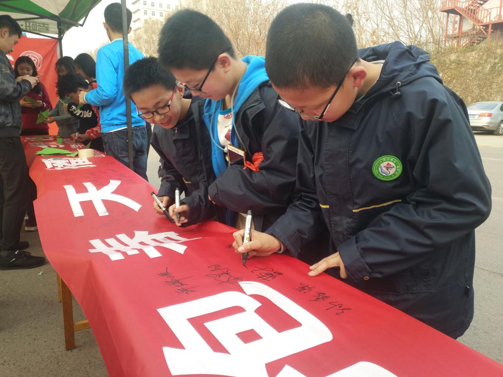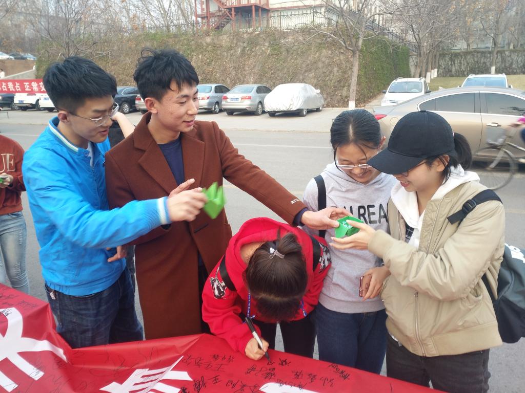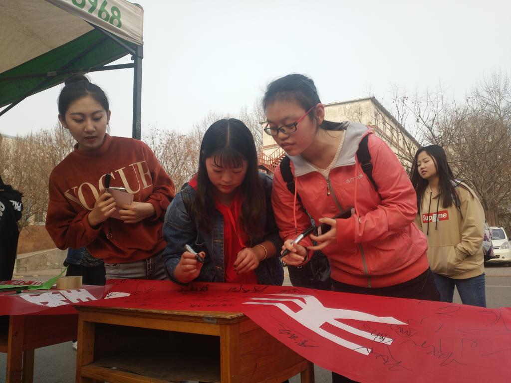 活动中,参与活动的同学们积极投入到绿色讲解的行动中。不时有过往的师生停下来询问事宜,了解活动后,志愿者向过往师生送出植物种子和盆栽,以传播绿色。随后,师生纷纷在宣传条幅上留下姓名,以示践行绿色环保理念从我做起。