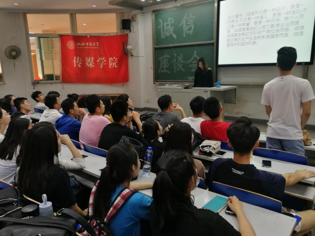 随后,同学们分享了一些有关诚实守信的故事,并对诚信考试、诚信就业等方面展开讨论,以积极引导我院学生树立“诚信第一、品格第一”的理念,并将诚信作为做人的基本准则和立业的根基。