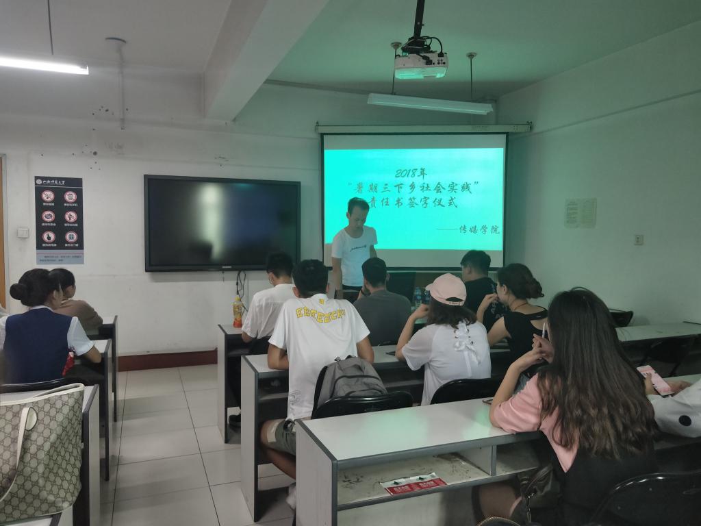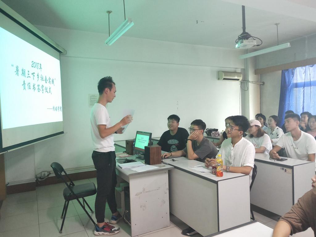 6月27日中午12时,我院于科学会堂B-406教室举行了2018年“暑假三下乡社会实践”责任书签字仪式,报名参加暑期三下乡的所有学生参加了此次仪式,仪式由“暑期三下乡社会实践”总负责人苗大地主持。