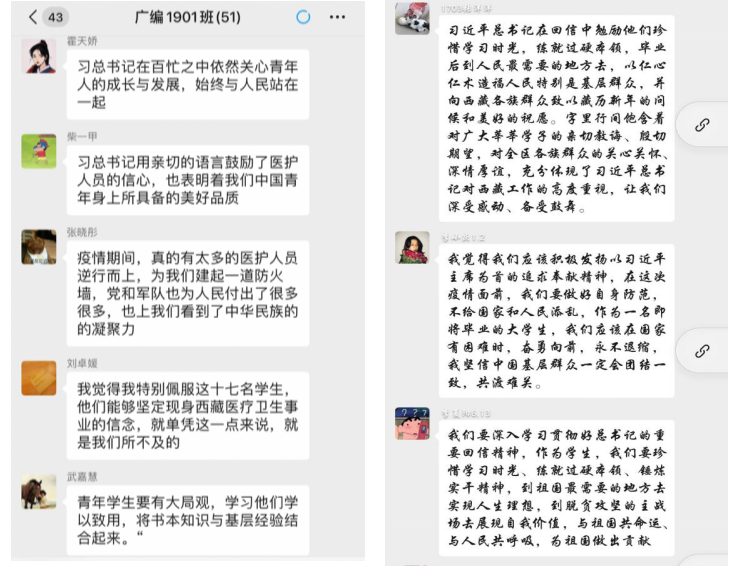 根据学院安排,各班通过个人自学、集中学习、网络学习等多种方式积极组织学生学习习近平总书记的回信精神。3月7日,广编1901团支部开展“学习回信精神 练就过硬本领”主题团日活动,播音1902团支部开展线上“学习回信精神 担当青春使命”主题团日活动;3月8日,空乘1703班召开“齐心协力 打赢疫情攻坚战”主题班会,空乘1704班召开“全党动员 全民行动 万众一心 众志成城”主题班会;3月9日,广编1701班开展“众志成城,共克时艰”线上主题班会活动。其余各班相继开展主题学习活动,此次活动,学习内容丰富,学习方式多样,覆盖范围广泛,取得了良好的学习效果。