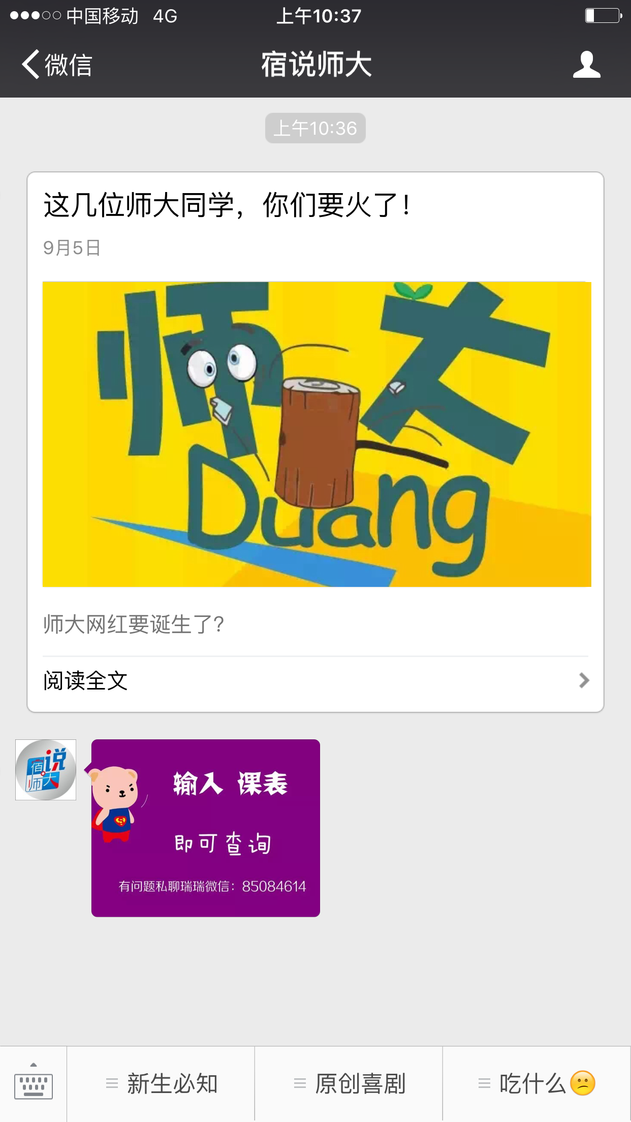 “宿说师大”从2015年12月1日起正式运营,“瑞瑞”这个具有自媒体性格化的自称在半年多的时间里,由于自媒体的优势特点和独特的图文排版风格,迅速融入师大学子的学习与生活中。目前,“宿说师大”微信公众平台提供查成绩、查课表、查教室、吃饭、二手市场以及原创喜剧等多项内容,特别是查成绩、查课表、查空教室等功能受到很多学生的欢迎。