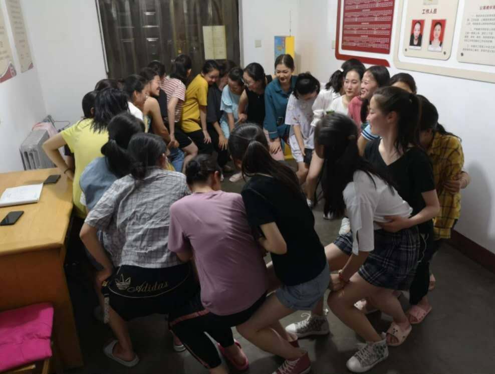 活动上,王金玉老师指导全体同学围成一圈,每位学员将双手放在前面一位学员的双肩上,听从文艺委员的指令,缓缓地坐在身后学员的大腿上。坐下后,指导员再给予指令,让学员叫出相应的口号,并且以小组竞赛的形式进行,看看哪个小组可以坚持最长时间不松垮。在整个过程,随着王金玉老师不断变化的指令,同学们反应热烈,场面非常的和谐。