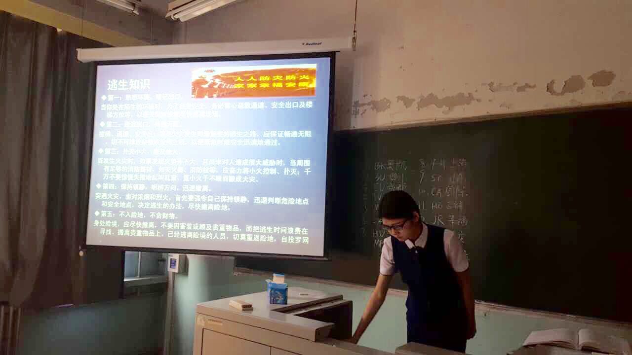 活动开始,班级团支书传达了消防安全的重要性。随后,宣传委员以ppt的形式向大家展示,从火灾的危险性、近年来高校发生的火灾大事件切入,让同学们深知危险就在身边。并且从同学们如何防止灾害的发生,发生后该如何处理这两方面进行学习教育,使同学对消防安全有了很高的认识。另外宣传委员还向同学们讲解了如何关爱自己、保护自己,让同学们受益匪浅。
