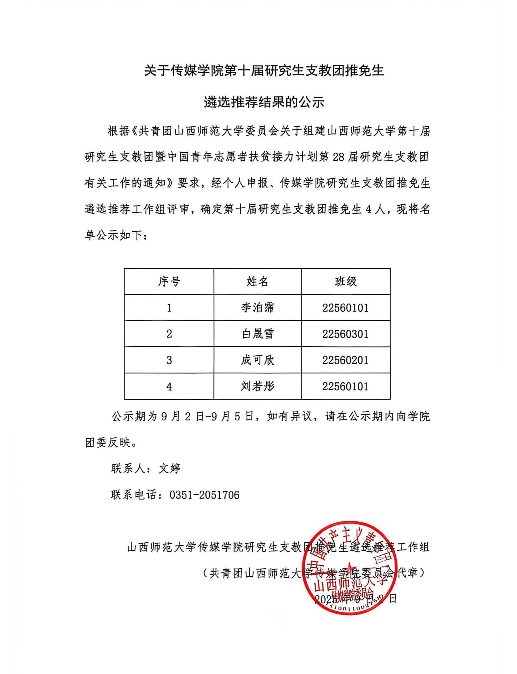 关于必发集团welcome欢迎光临第十届研究生支教团推免生遴选推荐结果的公示