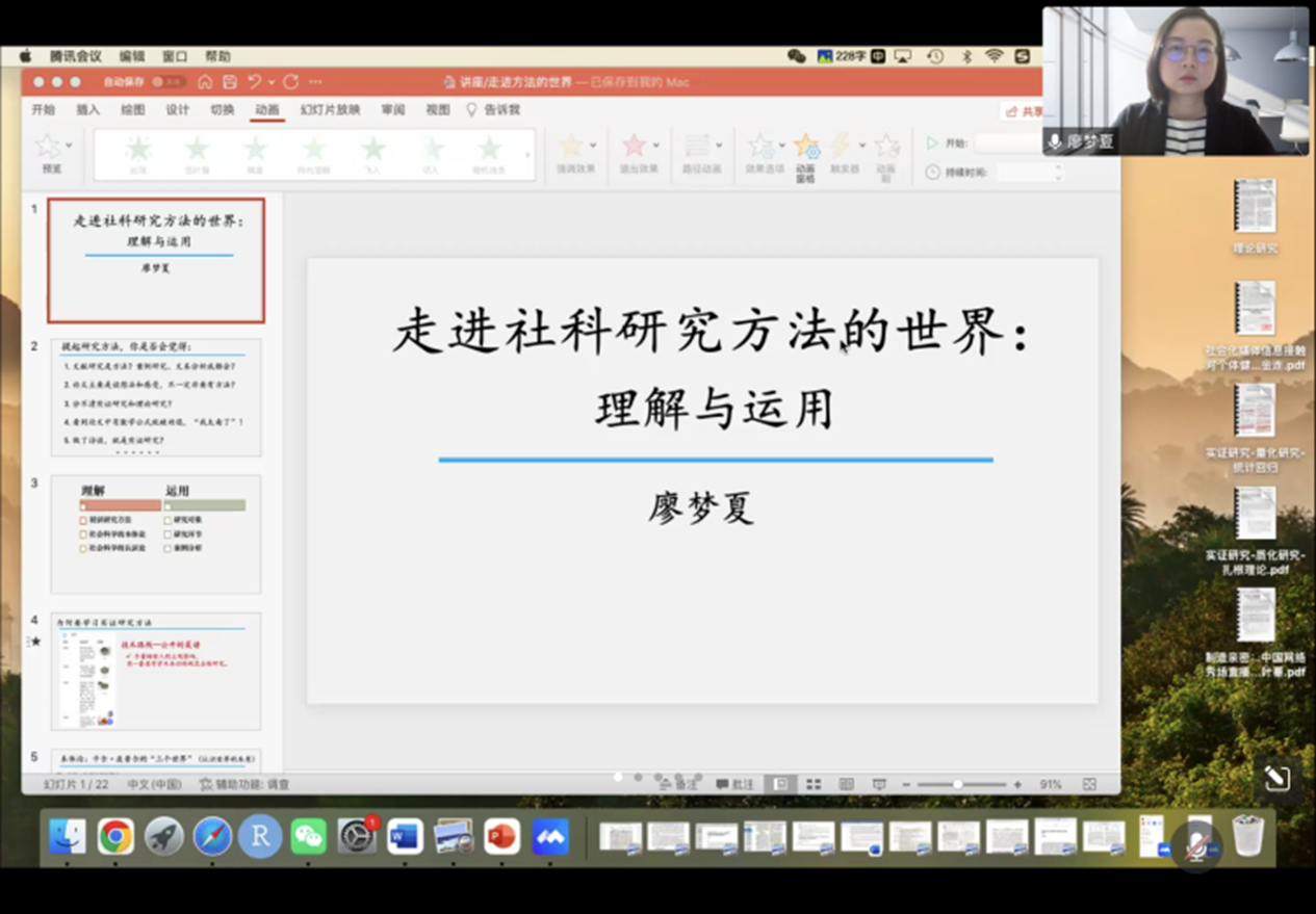2022年11月11日19时,我院特邀四川外国语大学新闻传播学院廖梦夏副教授作了题为《走进社科研究方法的世界:理解与运用》的线上讲座。会议由必发集团welcome欢迎光临白岩老师主持并作总结发言,必发集团welcome欢迎光临部分师生参加本次讲座。