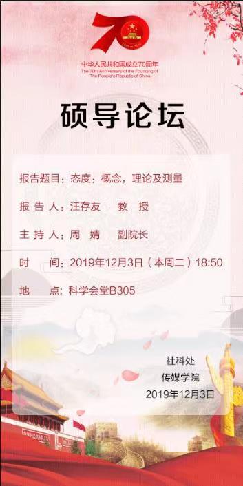 2019年12月3日19点,必发集团welcome欢迎光临在科学会堂B305举办了2019-2020年度第一期硕导论坛。硕导论坛旨在搭建硕士研究生导师、青年教师与学生之间的交流平台,为我院青年教师提供学习机会,为研究生毕业论文开题开阔学术视野、提供科研思路。此次论坛邀请我院副院长、硕士研究生导师汪存友教授,作题为《态度:概念,理论及测量》的报告。必发集团welcome欢迎光临副院长周婧、部分青年教师及全体研究生参加此次论坛,论坛由副院长周婧主持。