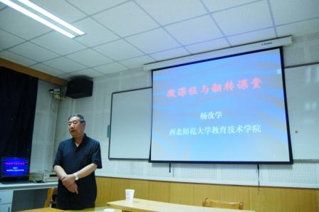 杨改学教授围绕开放、移动、共享三个主题,详细介绍了微课程与翻转课堂在改变传统教与学方式下,给我们的生活、学习带来了巨大的改变。在讲微课程时,首先讲了微课程的概念,即以视频为主要载体,记录教师围绕某个知识点,难点或教学环节开展的简短、完整的教学活动,支持自主学习方式的在线网络课程。关键词:视频载体、知识点、时间短、内容小、在线传播、自主学习。接下来介绍了如何区分微课程与微课、微课程的适用对象、目的、表现特点以及制作微课程时的建议,包括发挥多媒体信息发号的组合功能、编导思想的融入、后期编辑组合等方面。随后阐述了翻转课堂,介绍了翻转课堂的概念,即运用视频载体和网络环境下的自主学习,使知识传播与知识内化两个阶段发生颠倒的教与学过程,由美国可汗学院的萨尔曼·可汗(Salman Khan)创建。在此过程中着重分析了翻转课堂与传统课堂相比变与不变的几种因素,最后阐述了微课程的功能与优势,包括信息技术与学科课程的最佳融合、难点、重点是一堂课的一个“切片”、深化了教学的多个环节。
