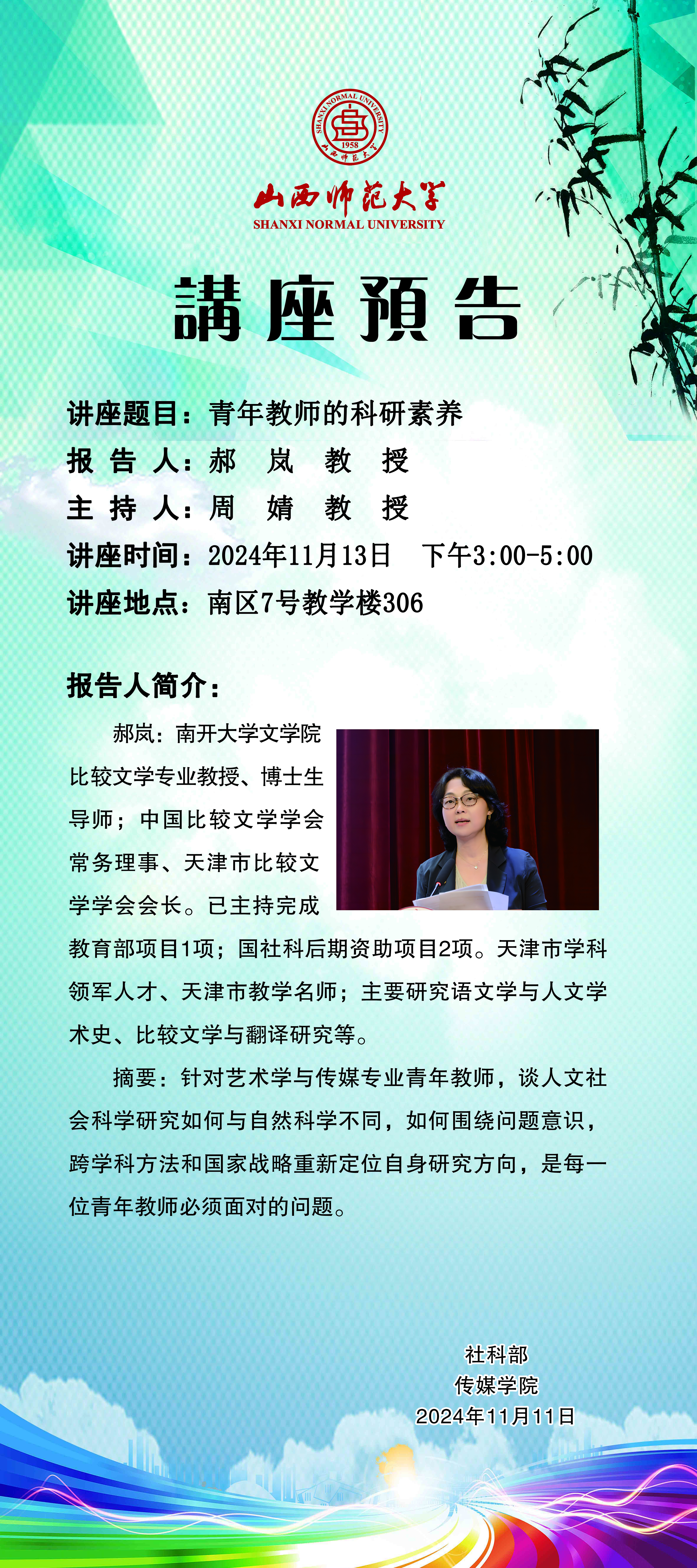 2024年11月13日下午3点,我院特邀南开大学文学院郝岚教授通过线上方式作了题为“青年教师的科研素养”专题讲座。本次报告是必发集团welcome欢迎光临2025年度国家社科基金申报精品系列讲座之一,由必发集团welcome欢迎光临副院长(主持行政工作)周婧主持,必发集团welcome欢迎光临部分青年教师聆听了此次讲座。