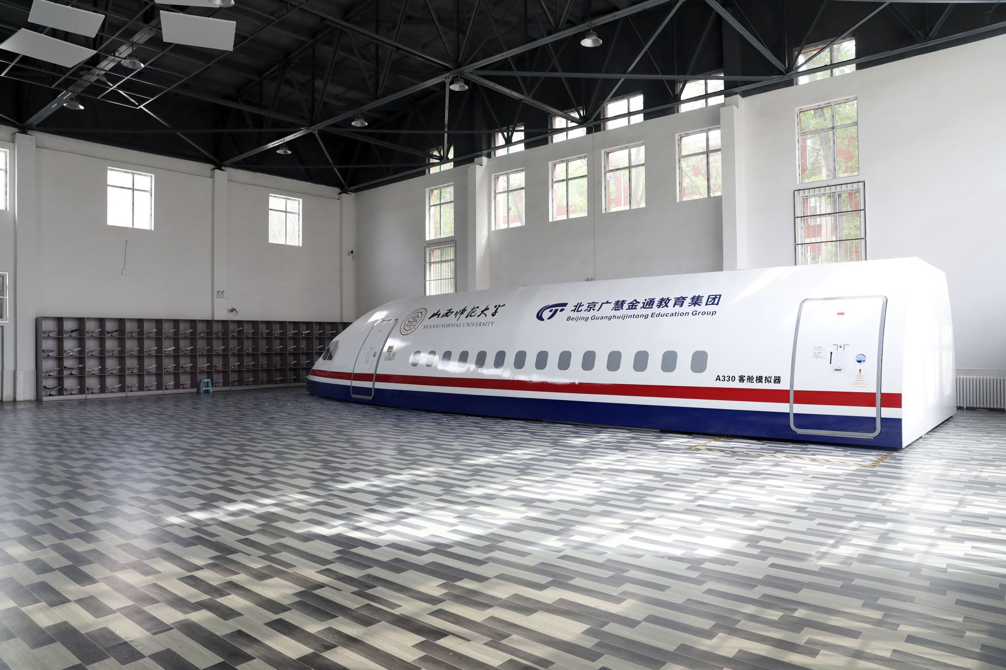 航空模拟舱实训室建于2012年,模拟舱是以双通道飞机空客A330为蓝本,其中包括了A330的头等舱、普通舱以及驾驶舱,为学生在机上的实操学习创造真实的环境,承担着航空服务艺术与管理专业的《民航客舱设备操作与管理》、《民航客舱服务与管理》实践实训教学任务,还承担客舱内礼仪服务、餐食服务与安全服务的模拟演练与实操教学。